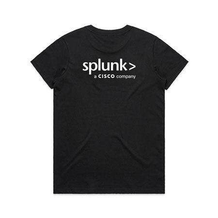 A black Splunk tee available in Men's and Ladies' sizes, featuring a front tagline as well as a Splunk logo on the back.