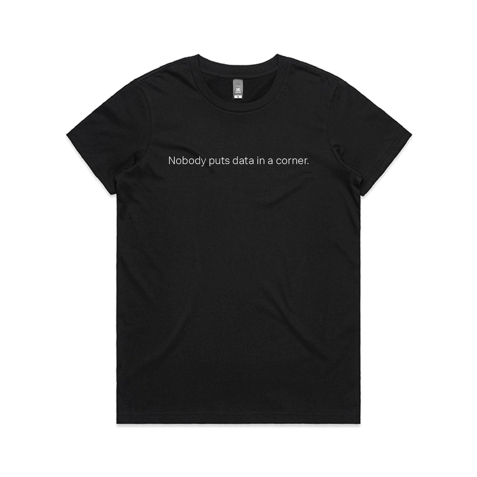 A black Splunk tee available in Men's and Ladies' sizes, featuring a front tagline as well as a Splunk logo on the back.